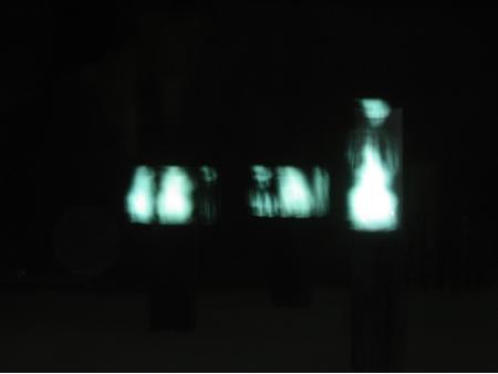 The direct interactivity with participants occurs at two levels. As the installation changes, participants at a distance will notice the changes, and will be drawn to discover the installation themselves. Our installation contains audio sensors that detect human sounds. As people approach their voices will cause changes in the light patterns and frequencies. Participants will notice that their speech influences the installation, and they will modulate their speech and sounds to cause the installation to change. As they approach and walk by the images they blocking the light momentarily. In a distance one sees a changing scene. You who now unknowingly become part of the art work, just by your existence, never knowing what ideas, thought, beliefs, superstitions you are causing for others at a distance.